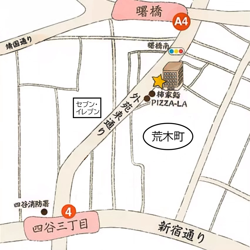 ※地下鉄丸ノ内線・四谷三丁目駅4番出口より徒歩5分、地下鉄都営新宿線・曙橋駅A4出口から徒歩3分